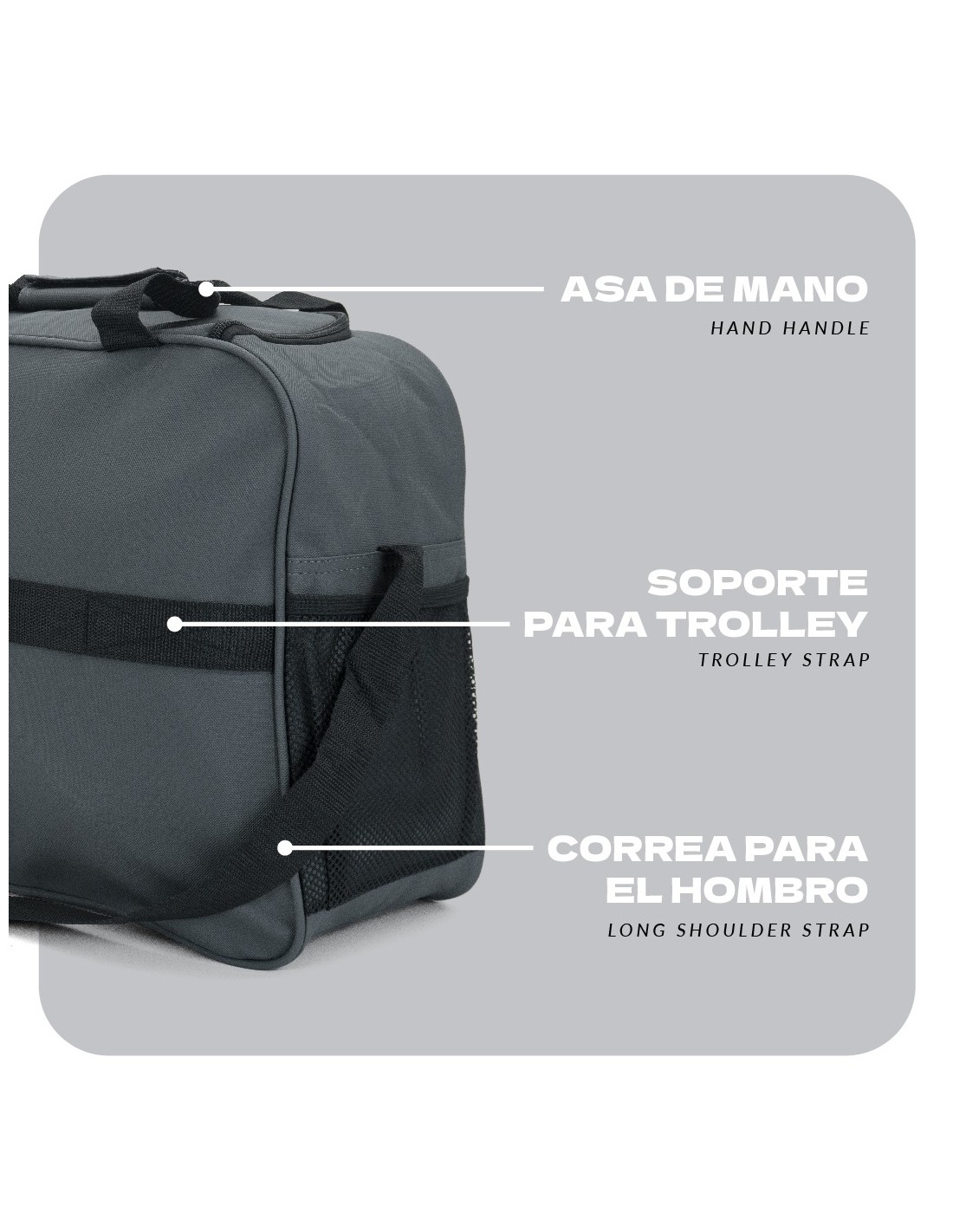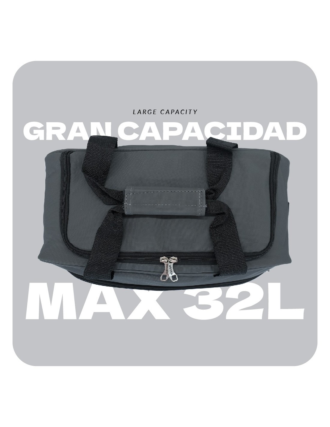• Dos asas de mano con cierre de abrojo + correa larga regulable para llevar al hombro.