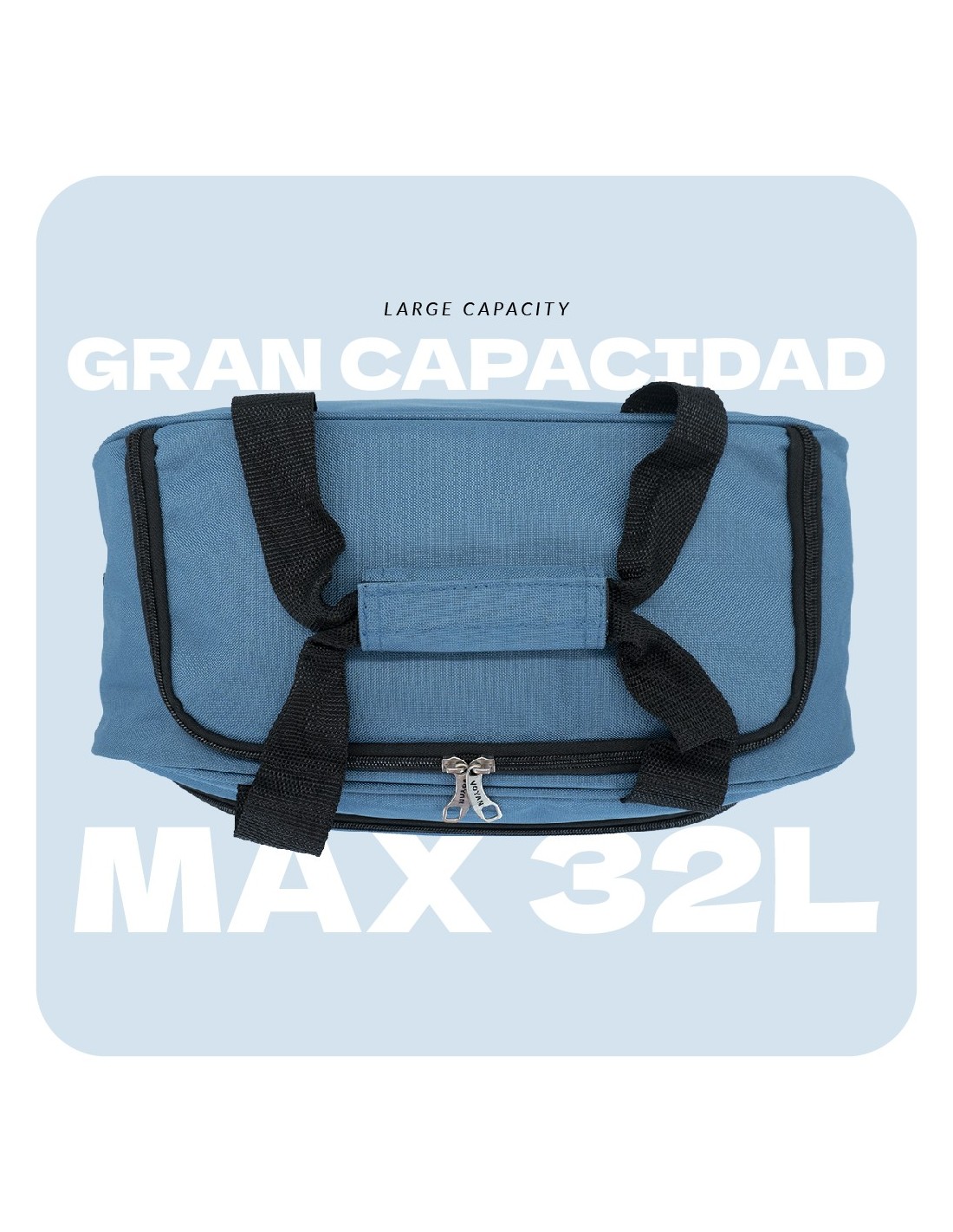 - Dos asas de mano con cierre de abrojo + correa larga regulable para llevar al hombro.
