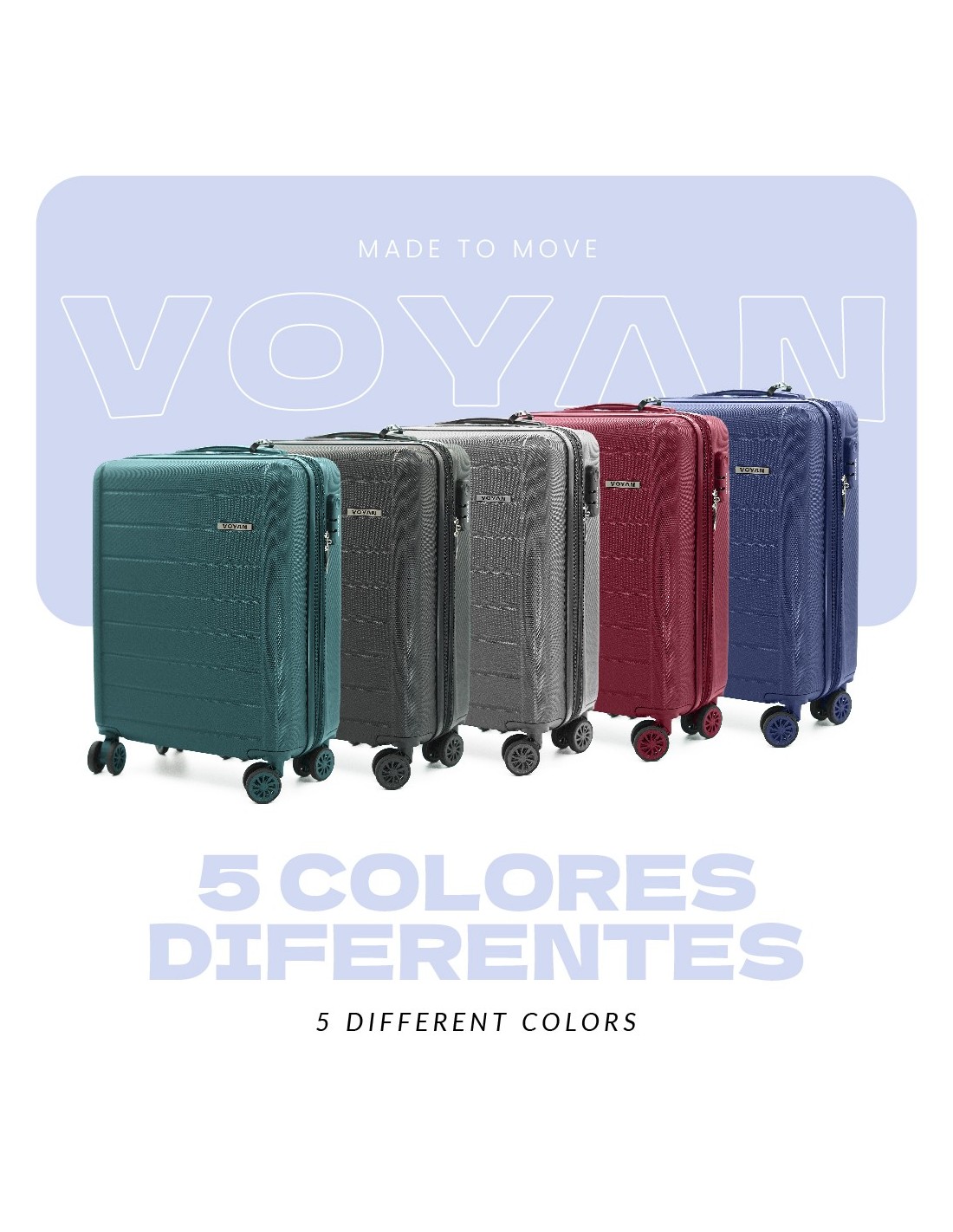 Disponible en cinco colores (negro, gris, azul, granate y verde), el set de viaje Voyan SDR maletas + neceser es la elección inteligente para viajes de ocio o trabajo: ligero, resistente y práctico, diseñado para mantener tus pertenencias organizadas, seguras y con una excelente relación calidad-precio.