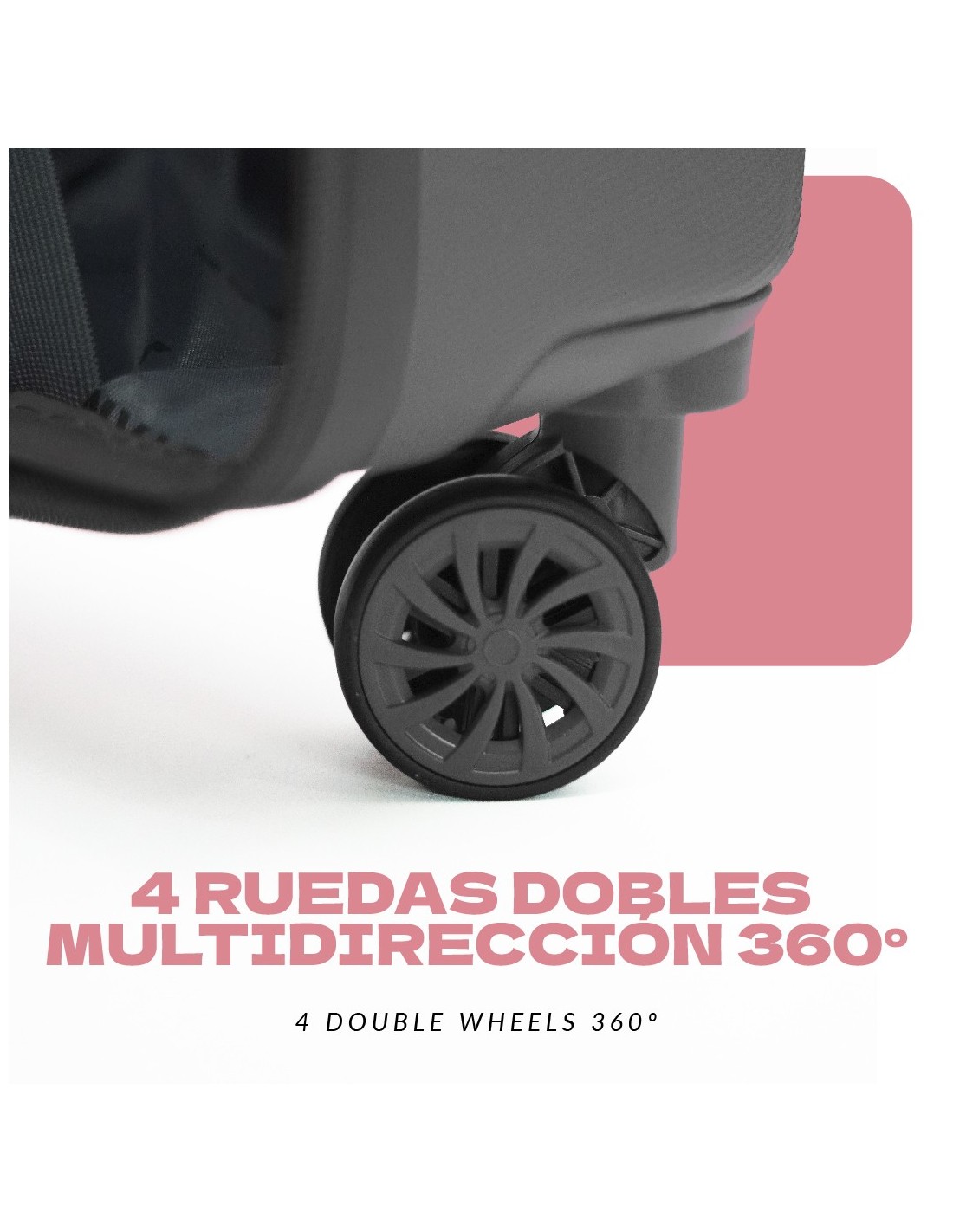 - Movimiento cómodo y silencioso con 4 ruedas dobles 360°, ideales para aeropuertos y trayectos urbanos.