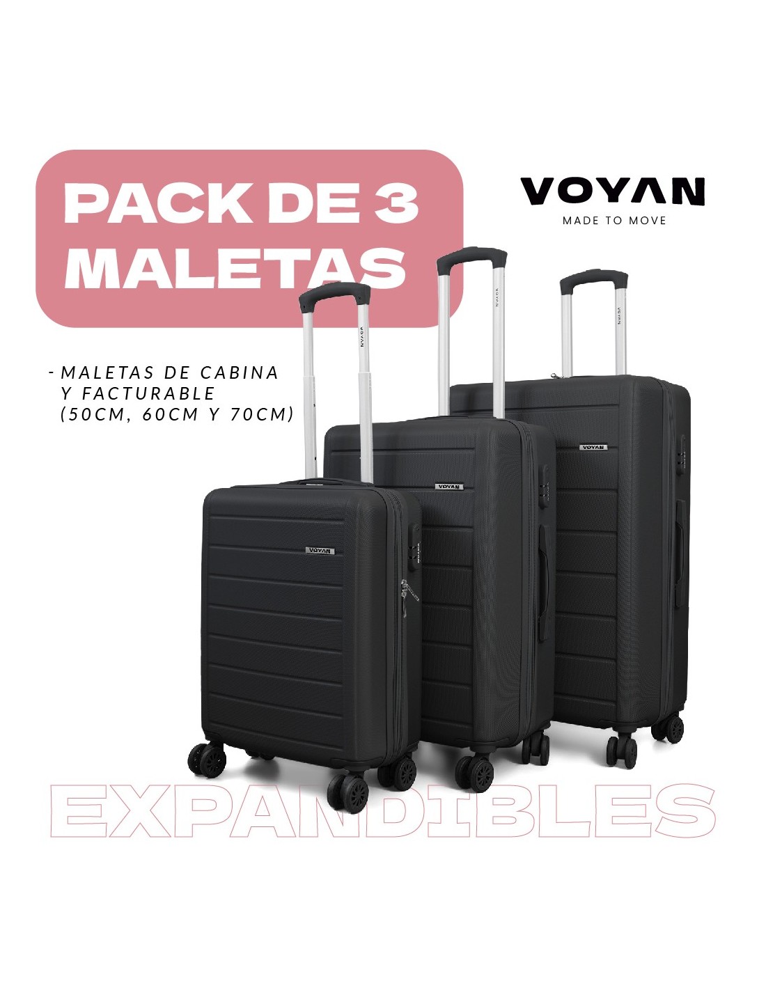 Este set de viaje,: ligero, resistente y práctico, es el compañero ideal para viajes prolongados o en familia, donde no te quedarás sin espacio para tus compras.