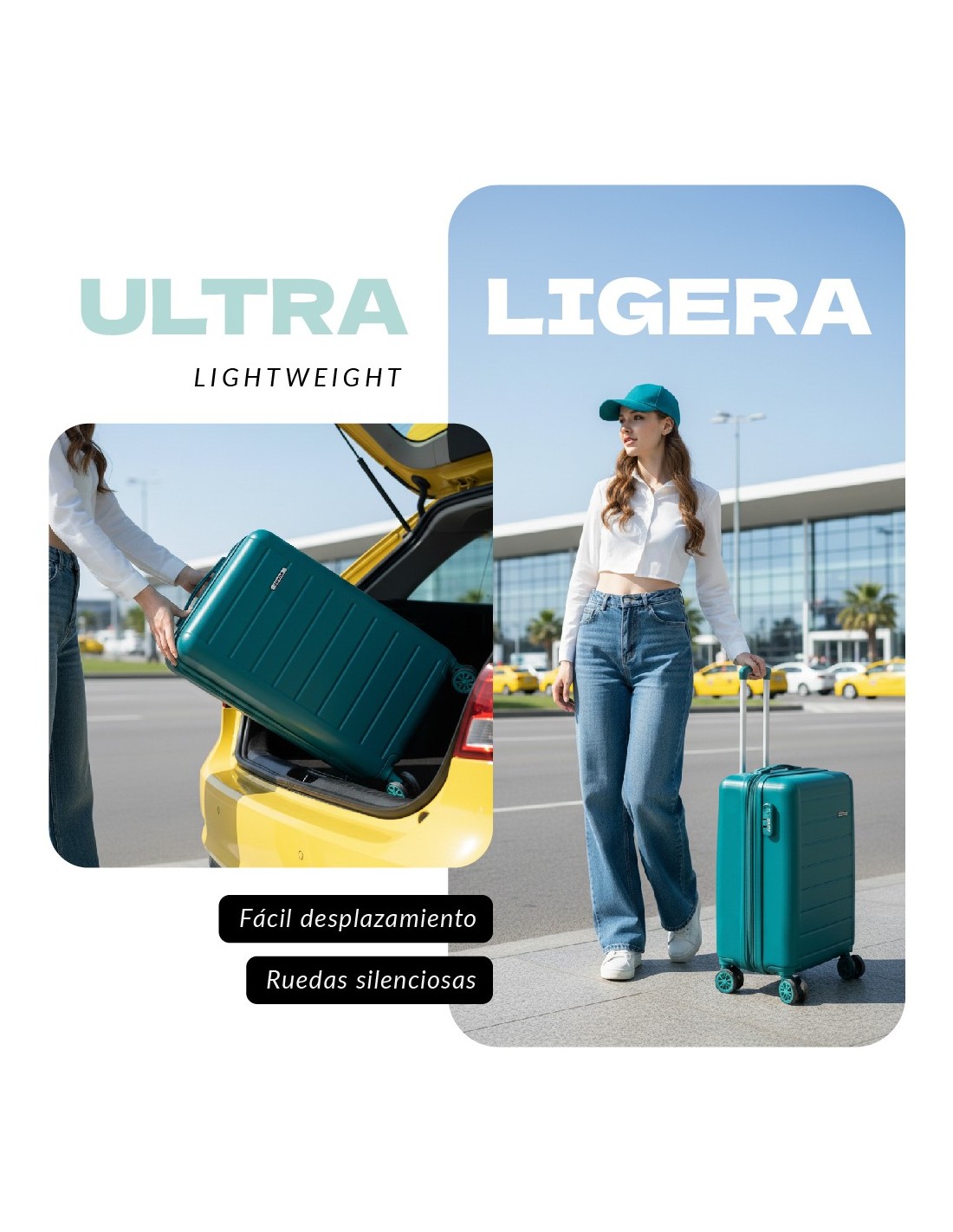 Este set de viaje,: ligero, resistente y práctico, es el compañero ideal para viajes prolongados o en familia, donde no te quedarás sin espacio para tus compras.