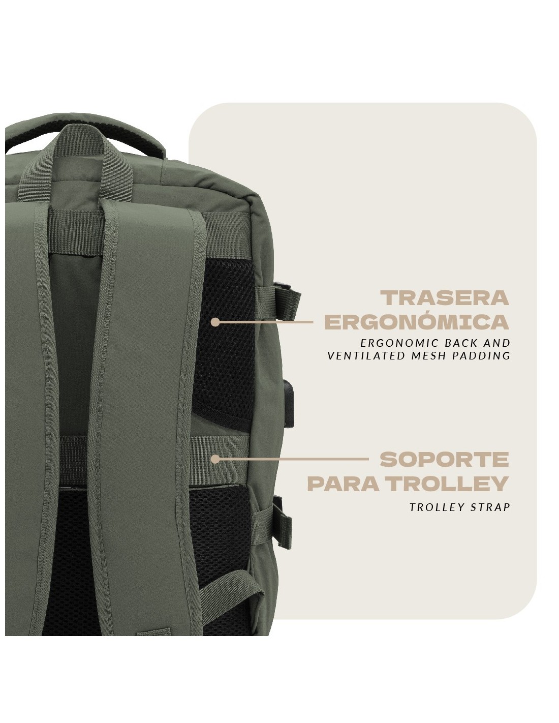 • Correa trasera para sujetarla al asa telescópica de la maleta.