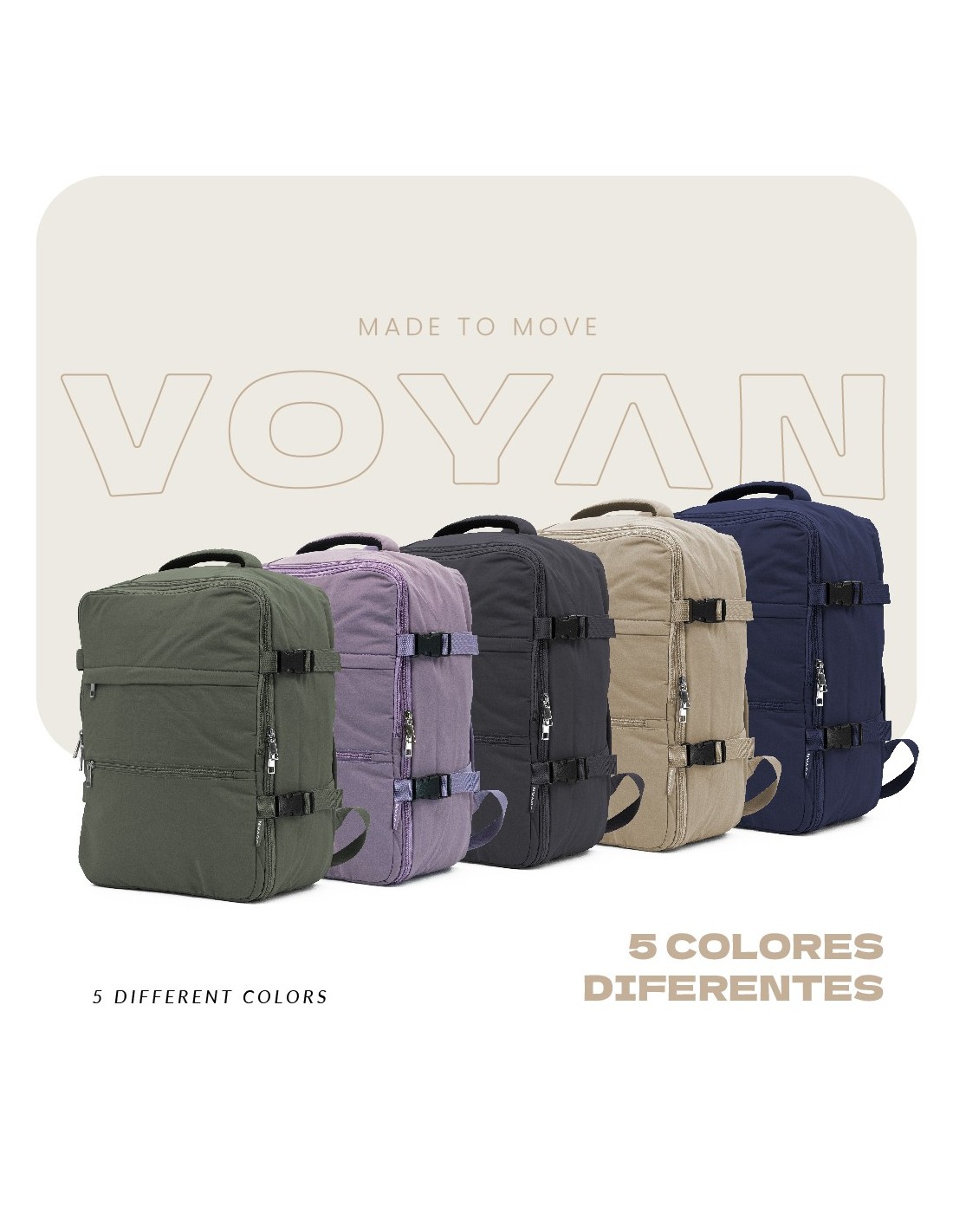 Las correas laterales de compresión ayudan a mantener la mochila compacta incluso cargada, asegurando que cumpla las medidas de cabina. Disponible en 5 colores modernos, la Voyan TRN combina seguridad, capacidad y comodidad en un diseño versátil para viajeros que buscan moverse con libertad y sin pagos adicionales.